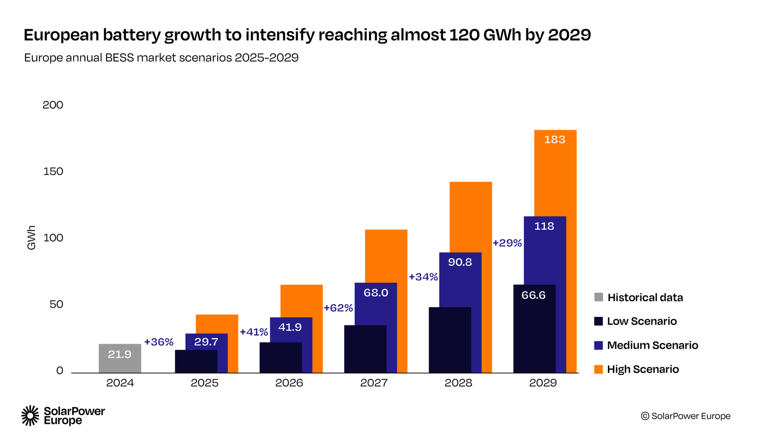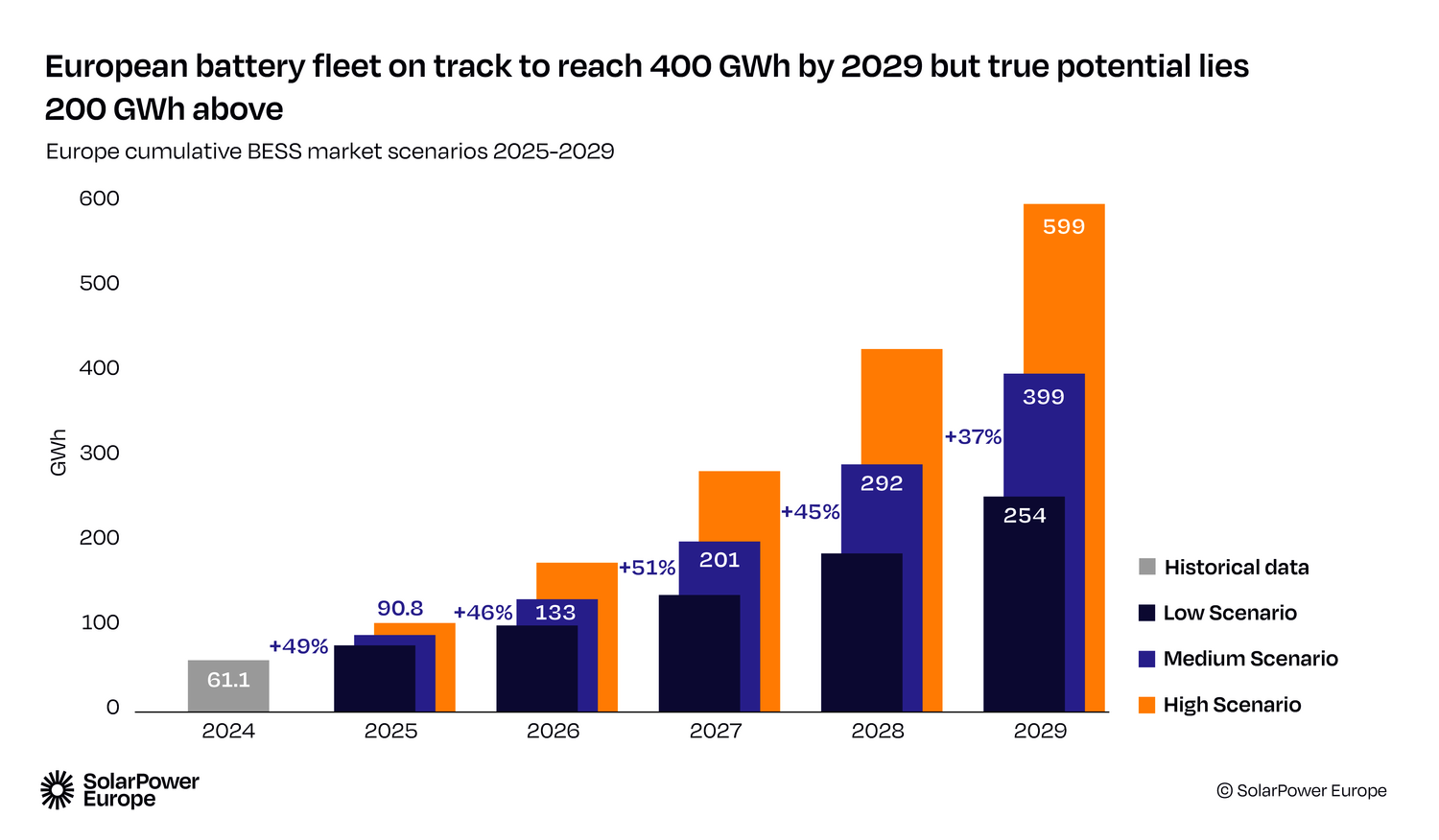 Despite positive market developments, SolarPower Europe stresses that the European battery storage market needs to grow at an even faster rate to meet the rising demand for grid flexibility. A potential total volume of up to 400 GWh is projected for 2029 – an ambitious but necessary target for the energy transition.