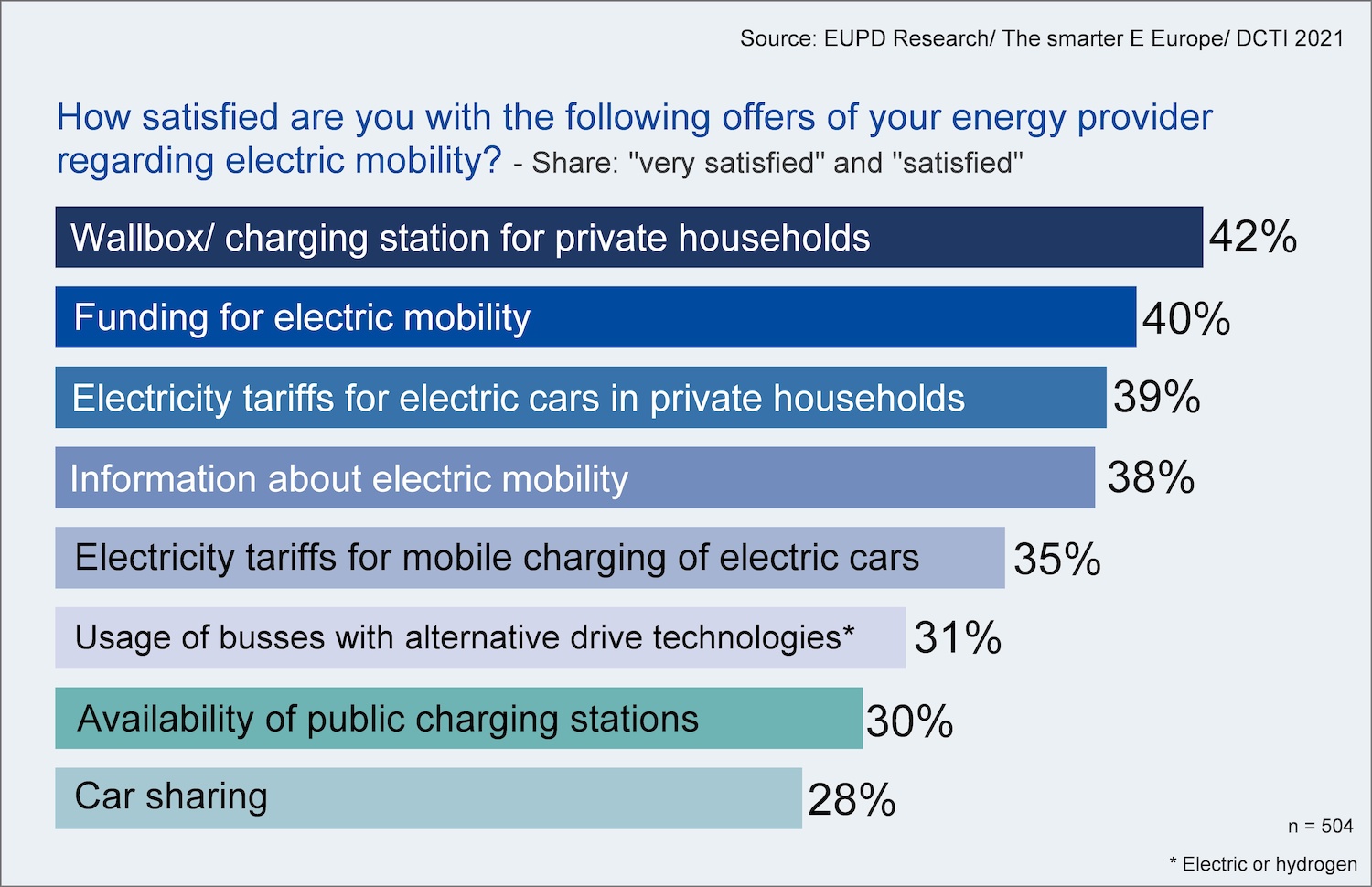 Traditional energy suppliers such as utilities play an important role for end consumers with respect to Energiewende. Moreover, energy suppliers have access to multiple ways to position themselves with new products and services in this area. How well energy suppliers manage this transition process or whether end consumers perceive their offerings, show the study results on the issue of electric mobility. 42 percent of surveyed households are satisfied with the wallboxes and charging stations offered to charge electric cars at home. This new topic is supported by a number of support programs and information offers, which also result in 40 and 38 percent satisfaction rates among survey respondents. Specific charging tariffs for home or mobile charging lead to similar satisfaction levels of 39 and 35 percent.